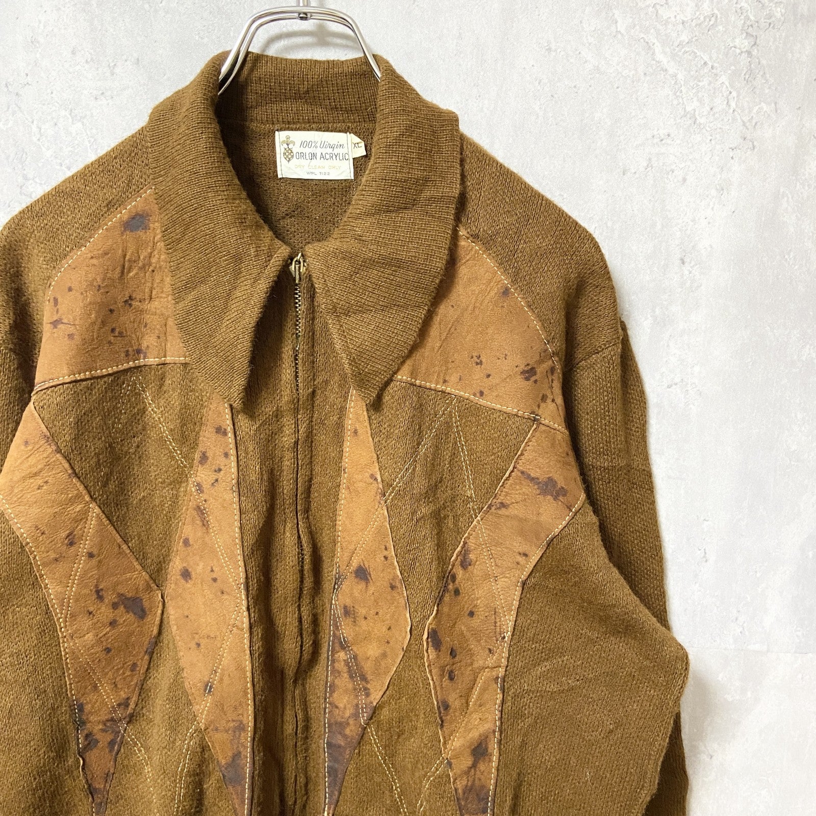 ~70s ORLON ACRYLIC フルジップカーディガン レザー パッチワーク 茶色 ヴィンテージ XLサイズ