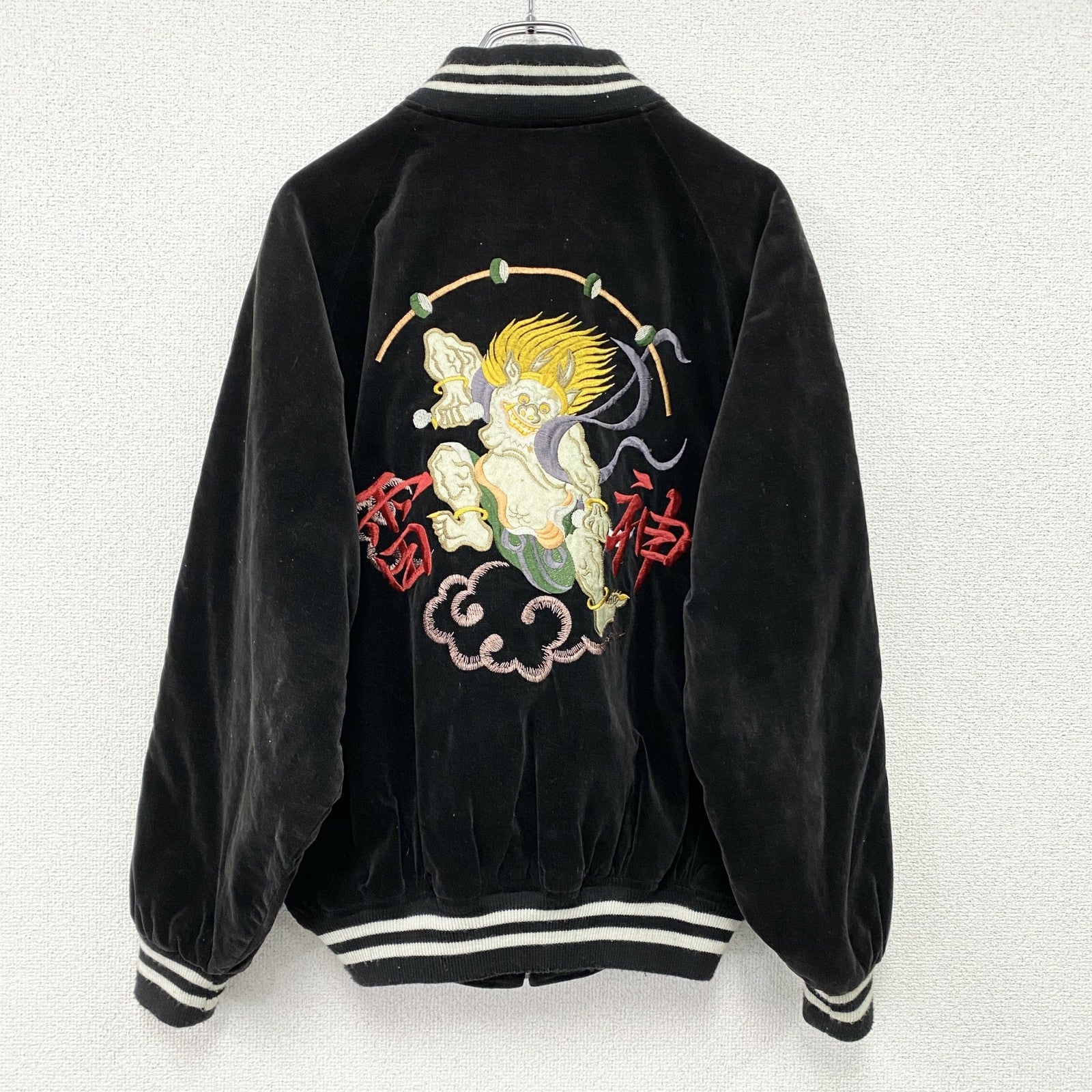 ~90s 風神 雷神 スカジャン スーベニアジャケット ヴィンテージ 漢字刺繍 和柄 別珍 ベロア 黒 ブラック